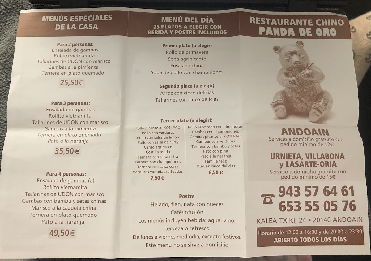 Welcome to Restaurante Chino Panda de Oro, a beloved gem located at Kaletxiki Kalea, 24, 20140 Andoain, Gipuzkoa, Spain. If you're searching for a delightful Chinese culinary experience that doesn't break the bank, you might just have found your new favorite spot. With a reputation built over the years, Panda de Oro has been consistently praised for its quality and value, as echoed in glowing reviews from satisfied customers.